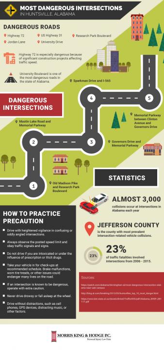 This infographic looks at the most dangerous intersections in Huntsville, AL. It explains how many crashes occur in these areas, and some tips for how drivers can more safely navigate these areas. If you live in this area, or if you are planning on visiting, this infographic can help you learn how to drive more safely and avoid dangerous crashes.